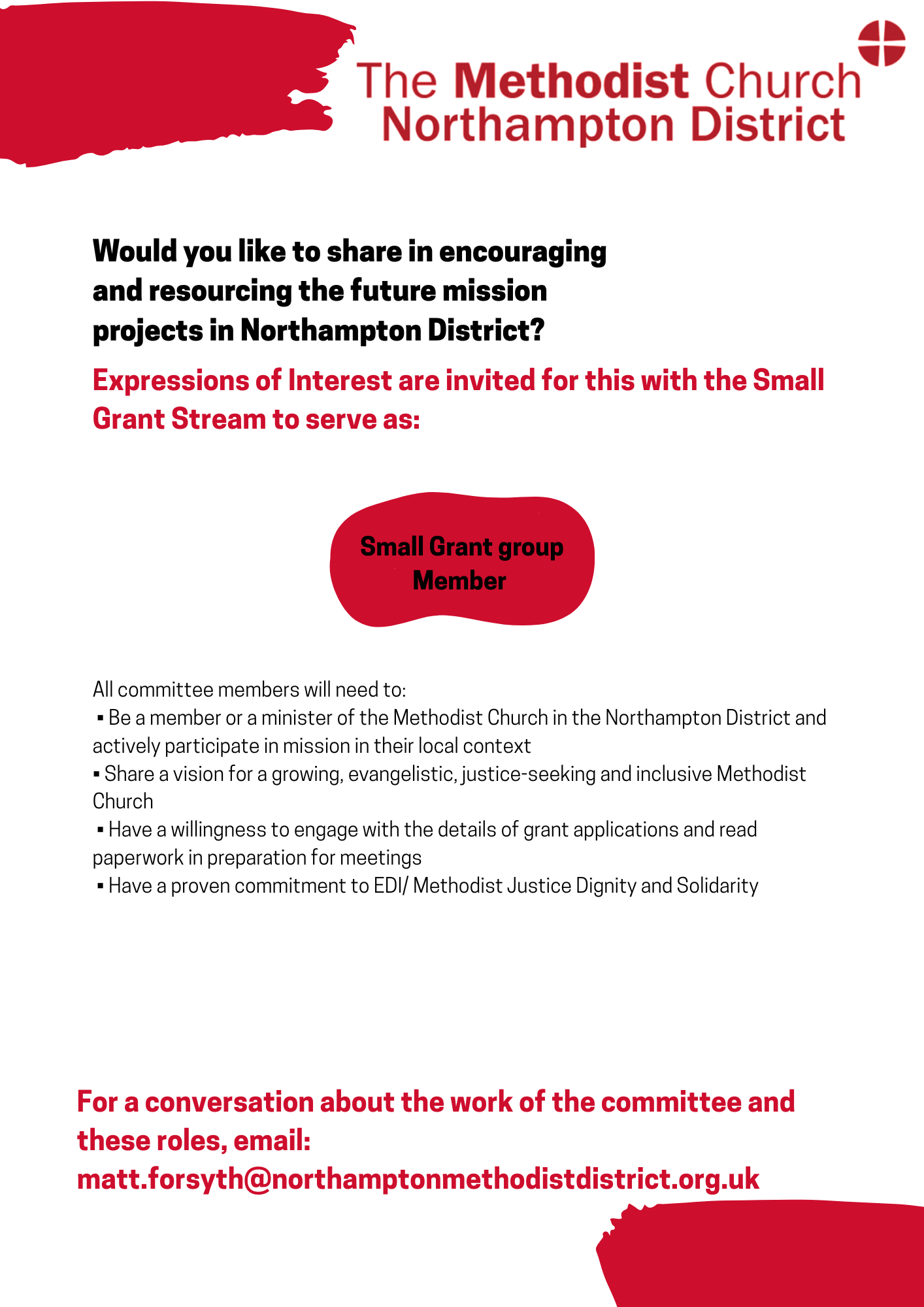 To find out more, please contact Mission Team Leader Matt Forsyth at this email matt.forsyth@northamptonmethodistdistrict.org.uk
